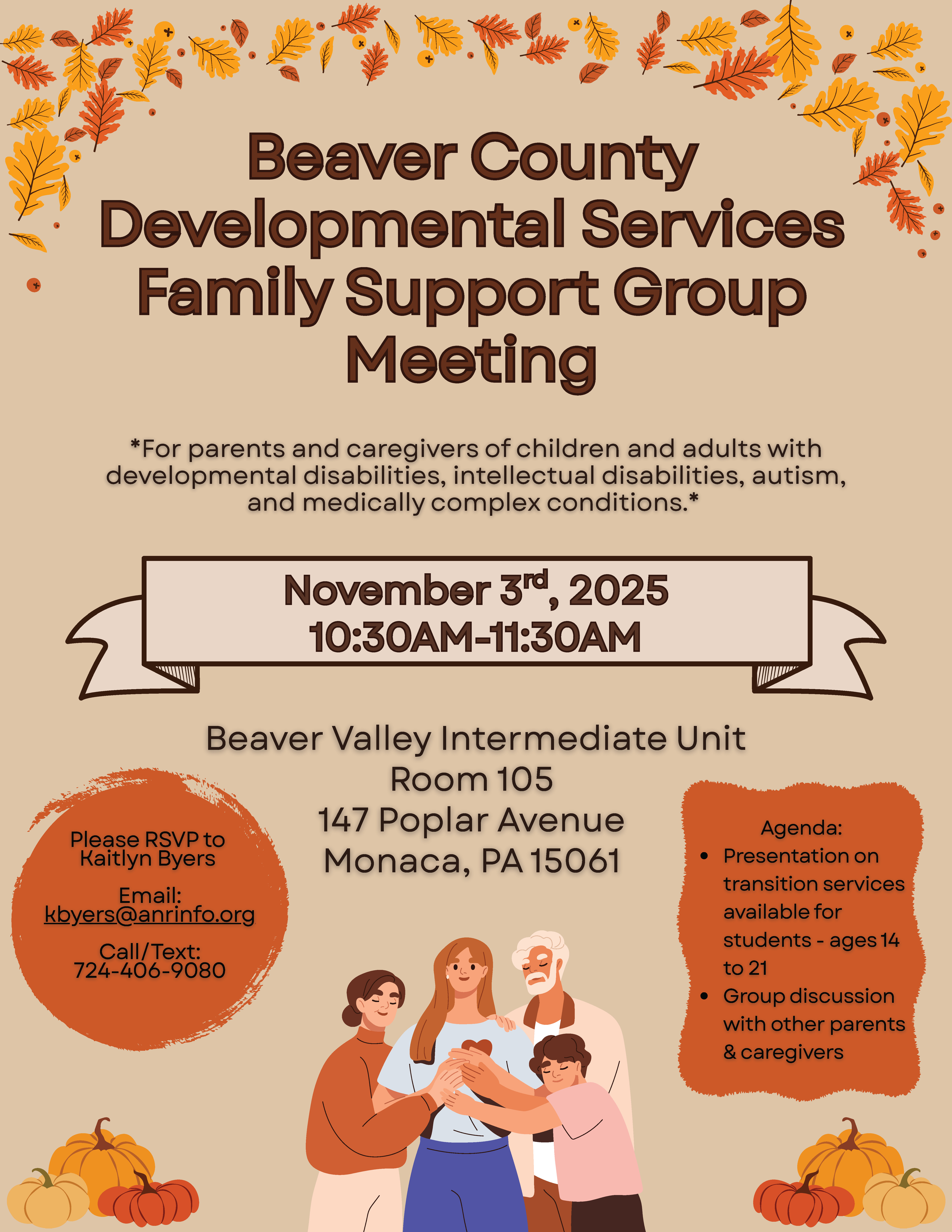 You are welcomed to join us on November 3rd, 2025 from 10:30am – 11:30am, for a Beaver County Developmental Services Family Support Group Meeting. This will take place at the Beaver Valley Intermediate Unit Room 105 (147 Poplar Ave., Monaca, PA 15061).