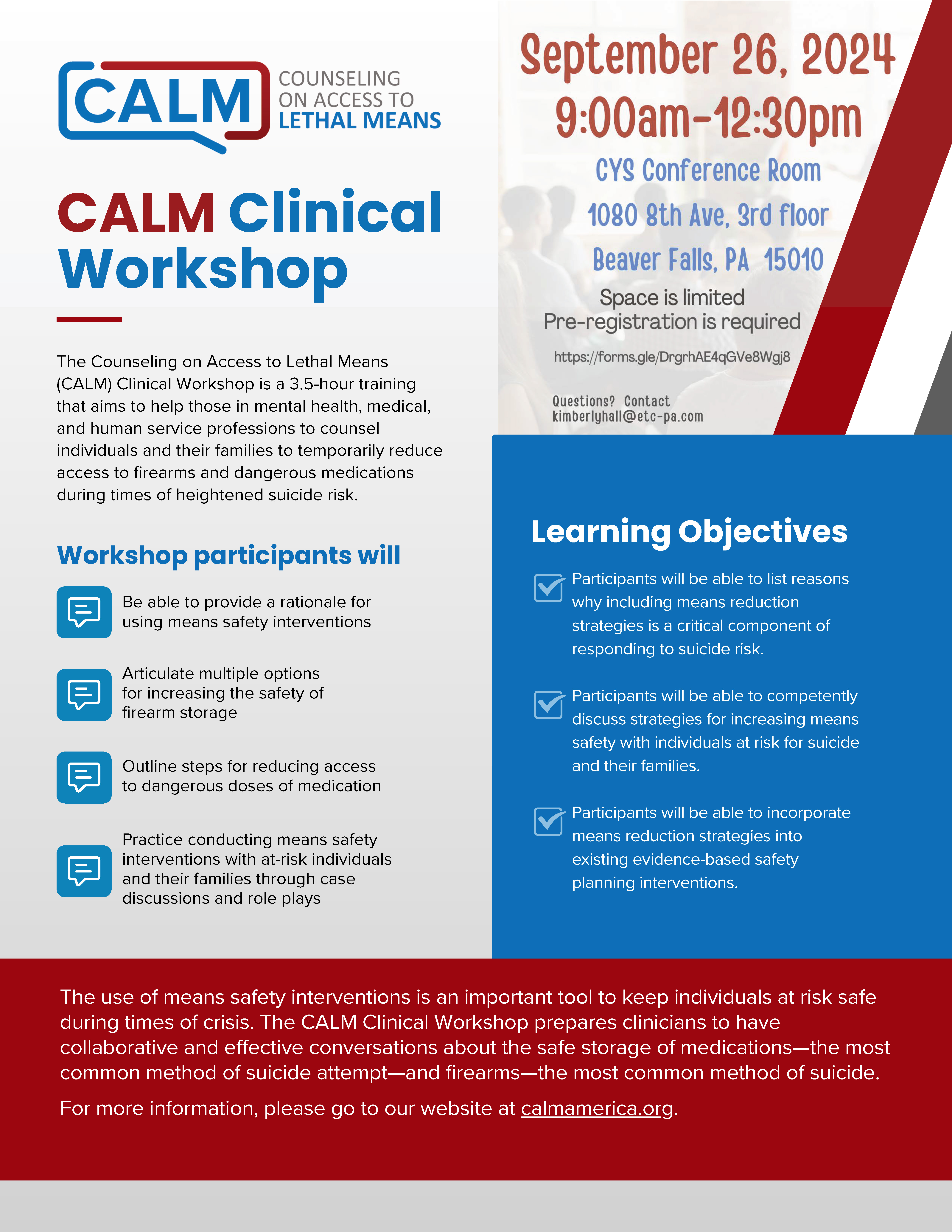 The Counseling on Access to Lethal Means (CALM) Clinical Workshop is a 3.5-hour training that aims to help those in mental health, medical, and human service professions to counsel individuals and their families to temporarily reduce access to firearms and dangerous medications during times of heightened suicide risk.