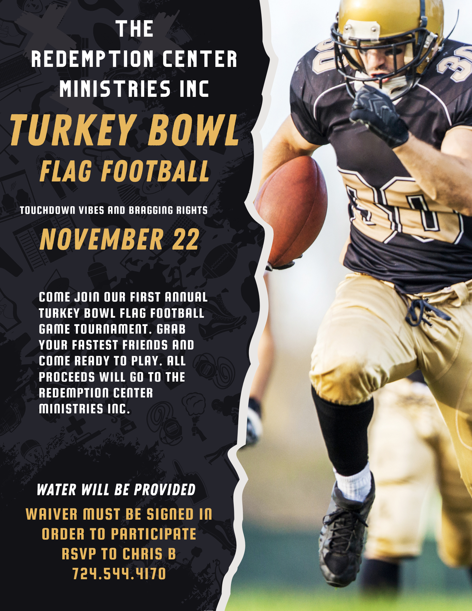 You’re invited to participate in The Redemption Center Ministries Inc. TURKEY BOWL Flag Football – Touchdown Vibes & Braggin Rights – on November 22nd!
