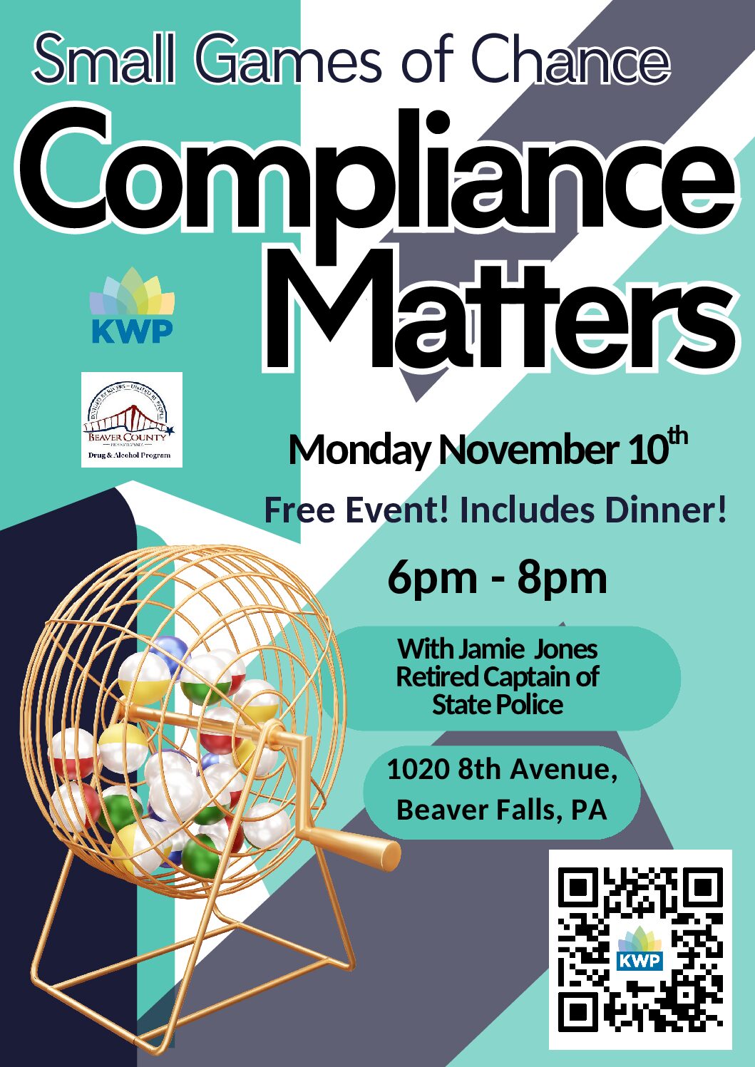 You’re invited to join us for Compliance Matters, on Monday, November 10th from 6PM – 8PM. This is a FREE Event that includes dinner. Speaker: Jamie Jones, Retired PA State Police and Liquor Control Board Enforcement When: Monday, November 10, 2025 from 6PM – 8PM Where: Beaver County Human Services Building 2nd Floor Conference ... Small Games of Chance – Compliance Matters Event
